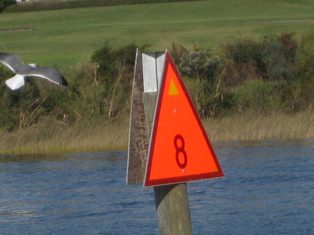 We have a few different ways to know where we are at any given time. We have paper charts, chart books and guidebooks. We use these to track where we are, give us the big picture of what is up ahead, and plan the next stop. We also have an electronic chartplotter that moves along with the boat similar to a car GPS, showing where we are on the chart. Along the way, there are red and green markers that show the channel — or the preferred place for your boat to go through. And on the ICW, there are yellow stickers on the markers or buoys, to show that you are in the intercoastal.