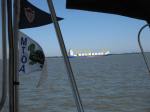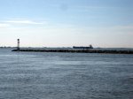 Finally out of the C&D Canal. We next stopped in Cape May, at Utsch’s as we did on the way down. Not a bad ride, but was a bit of a long day. We thought that were were seeing more of the dreaded crab pots, but were actually seeing large quantities of dead Horseshoe crabs. And for the last ten miles we were inundated with a zillion flies, so much so that I had to break out one of my supply of special Belhaven sticky fly traps. Now I have to go and vacuum the dead bodies. Ah, the joy of living on a boat. I will not gross you out with photos of dead crabs and flies. We did see a few of the big boys passing by in the shipping lane. Also, a nice lighthouse which “someone” insisted was actually a sailboat in the distance. Saw an eagle fly in and land on a pole, but alas, no closeup. Skipper saw what will probably be the last of the dolphins on this leg of the trip.